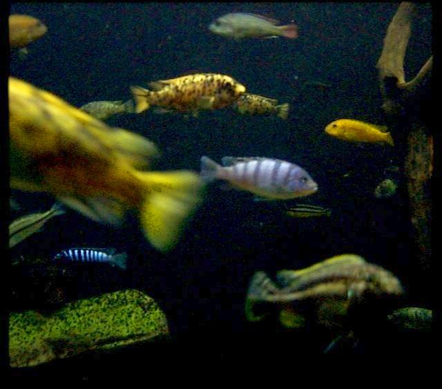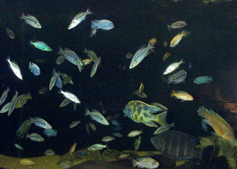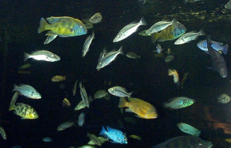 | Most of the fish you will see in the Aquarium are teleosts, including several species of cichlids. The Lake Malawi cichlids are a particularly interesting group, both because of their bright beautiful colors and because of their variety. The cichlids pictured here are members of a group of fish that live and breed in rock piles -- Mbuna. African cichlids have astonishing diversification -- genetic evidence suggests that over 500 species of cichlids in Lake Malawi have emerged in the last 2 million years. This rapid evolutionary change has been attributed both to the isolating effect of living in rockpiles and to changes associated with mating selection. |